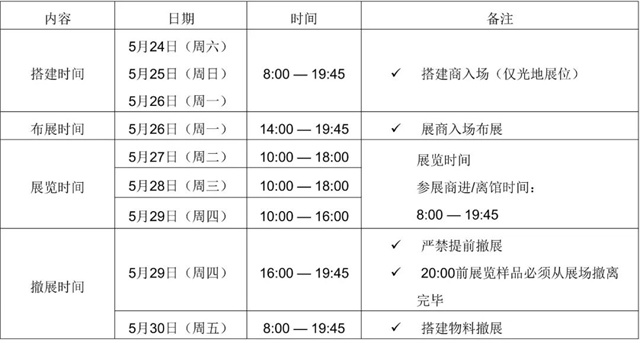 4. 請各組團單位務必監督展商遵守展覽會規定的時間,即撤展工作只能從 2025 年 5 月 30 日 16:00 之后開始,如發現提前撤展,主辦方將追究其相關責任。本展覽會為非零售展覽會,故禁止以現金形式零售任何產品或出現“SALE”等字樣。如欲將產品贈送客戶,請通知客戶在 2025 年 5 月 30日 16: 00 以后才能取走樣品。